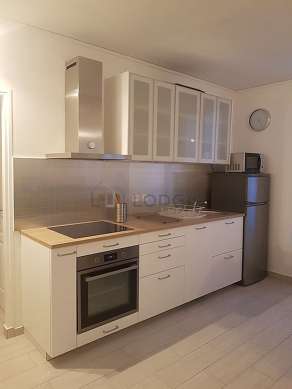 Este apartamento posee una magnífica cocina con parquet en el sueloy todo el equipamiento indispensable para su vida diaria : placas eléctricas, refrigerador, congelador, horno, micro ondas, campana extractora, tostador, cafetera, estantería, armario empotrado, vajilla, electrodomésticos, 1 silla(s), taburete, bar, mixer.