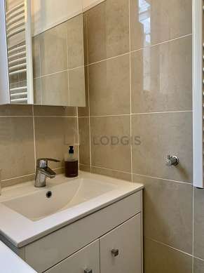 Este apartamento tiene una sala de baño agradable y muy clara with ventanas doble acristalamiento. Este baño tiene todo lo necesario para su bienestar diario : toallas, estantería, armario empotrado, bañera, secador de pelo, sink, bin, radiador seca-toallas, ventilator. El WC está separado de la sala del baño y ubicado en un espacio independiente.