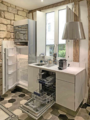 Este apartamento posee una magnífica cocina con azulejo en el sueloy todo el equipamiento indispensable para su vida diaria : placas eléctricas, refrigerador, horno, congelador, campana extractora, cafetera, armario empotrado, vajilla.
