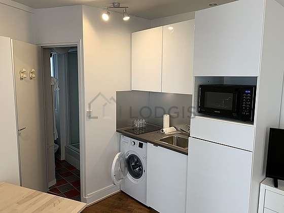 Este apartamento posee una bonito cocina con parquet en el sueloy todo el equipamiento necesario para su vida diaria : placas eléctricas, refrigerador, horno, mesa, armario empotrado, vajilla, 1 silla(s).
