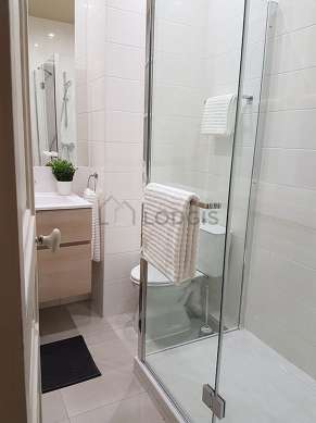 Este apartamento tiene una sala de baño magnífica. Este baño tiene todo lo necesario para su bienestar diario : toallas, estantería, ducha, sink. El WC está integrado en la sala del baño.