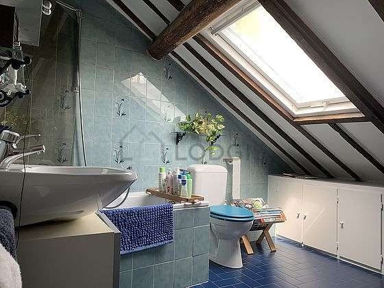 Este apartamento tiene una sala de baño magnífica y clara. Este baño tiene todo lo necesario para su bienestar diario : toallas, estantería, bañera, viga, sink, radiador seca-toallas. El WC está integrado en la sala del baño.