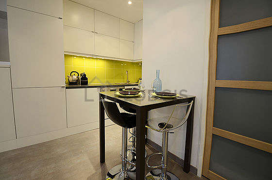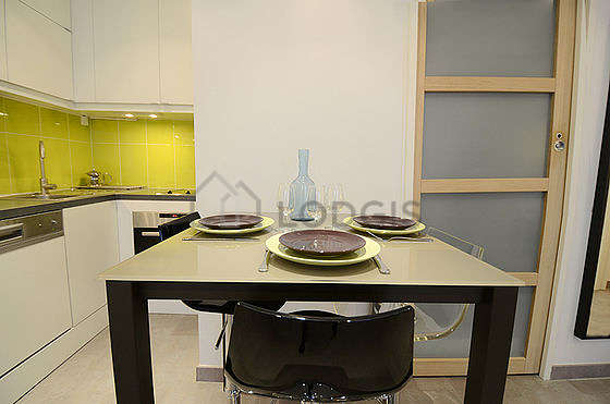 Este apartamento posee una magnífica cocina contiguo al salóny todo el equipamiento necesario para su vida diaria : placas eléctricas, refrigerador, congelador, horno, mesa, vajilla, taburete.