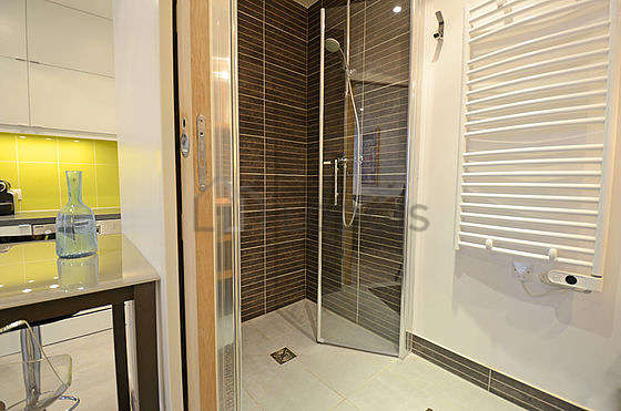 Este apartamento tiene una sala de baño magnífica y clara. Este baño tiene todo lo necesario para su bienestar diario : estantería, ducha, sink, radiador seca-toallas. El WC está separado de la sala del baño y ubicado en un espacio independiente.