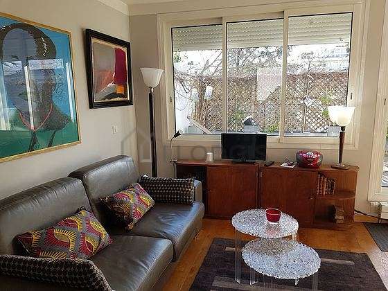 Este apartamento está formado por un salón con parquet en el suelo una vista a jardín. Este salón tranquilo está amueblado y equipado para que su estancia sea agradable : televisor, sábanas, edredones, refrigerador, 1 sillones, mesa, mesita, biblioteca, estantería, cómoda, armario empotrado, vajilla, 1 silla(s), bar, floor lamp, mirror, bin, painting, carpet, vase1 sofá cama.