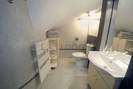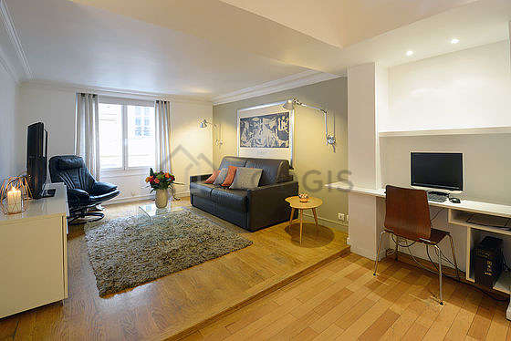 SalónEste apartamento está formado por un salón con parquet en el suelo y ventanas. Este salón está amueblado y equipado para que su estancia sea agradable : televisor, sábanas, sofá, 1 sillones, mesa, mesita, mesa de estudio, biblioteca, vajilla, 1 silla(s), tv stand1 sofá cama.