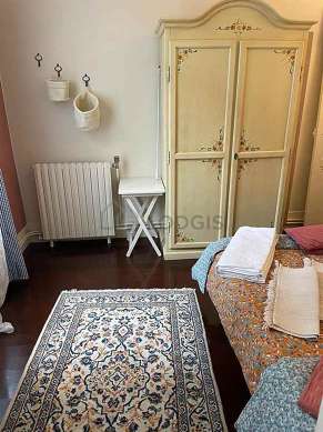 Este apartamento está formado por un salón con parquet en el suelo y ventanas y una vista a jardín. Este salón tranquilo está amueblado y equipado para que su estancia sea agradable : televisor, sábanas, edredones, sofá, mesa, mesa de estudio, ropero, estantería, armario, cómoda, armario empotrado, vajilla, 1 silla(s).