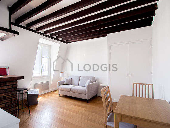 Este apartamento está formado por un salón con parquet en el suelo y ventanas. Este salón muy tanquilo está amueblado y equipado para que su estancia sea agradable : mesa, viga, 3 silla(s)1 sofá cama.