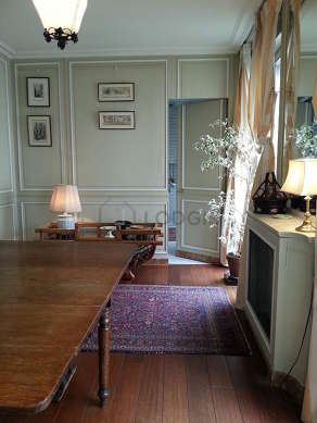 Con el fin de compartir vuestras comidas en un ambiente distendido durante su estancia en París, este apartamento posee un agradable comedor que podrá reunir hasta 4 invitados gracias a mesa, biblioteca, estantería, 1 silla(s), bin, painting, carpet.
