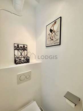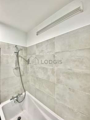 Este apartamento tiene una sala de baño magnífica. Este baño tiene todo lo necesario para su bienestar diario : toallas, estantería, armario, armario empotrado, bañera, secador de pelo, sink, towel rack, bin, radiador seca-toallas. El WC está separado de la sala del baño y ubicado en un espacio independiente.