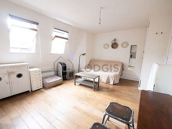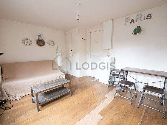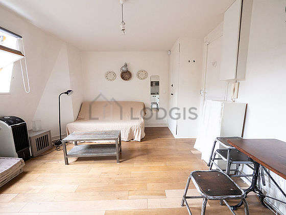 SalónEste apartamento está formado por un salón con parquet en el suelo y ventanas. Este salón muy tanquilo está amueblado y equipado para que su estancia sea agradable : edredones, sofá, mesa, mesa de estudio, armario, vajilla, 1 silla(s)1 sofá cama.