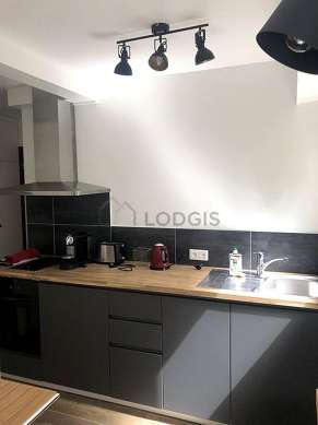 Este apartamento posee una cocina con parquet en el sueloy todo el equipamiento indispensable para su vida diaria : placas eléctricas, refrigerador, campana extractora, tostador, cafetera, vajilla, mixer, bin.