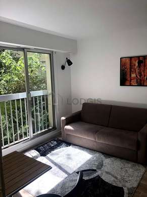 SalónEste apartamento está formado por un salón con parquet en el suelo y ventanas y una vista a jardín. Este salón está amueblado y equipado para que su estancia sea agradable : televisor, sábanas, edredones, sofá, mesa, mesa de estudio, estantería, vajilla, 2 silla(s), mirror, painting, carpet1 sofá cama.