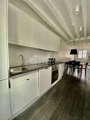 Este dúplex posee una magnífica cocina con parquet en el sueloy todo el equipamiento indispensable para su vida diaria : placas eléctricas, refrigerador, congelador, horno, campana extractora, tostador, hervidor, cafetera, ropero, armario empotrado, vajilla.