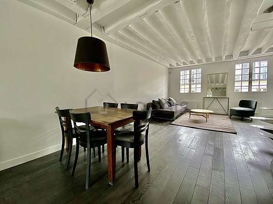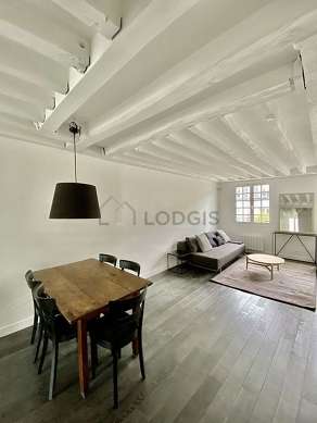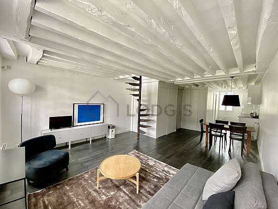 SalónEste dúplex está formado por un salón con parquet en el suelo y ventanas y una vista a la calle. Este salón tranquilo está amueblado y equipado para que su estancia sea agradable : televisor, sofá, mesa, mesita, aparador, 1 silla(s).