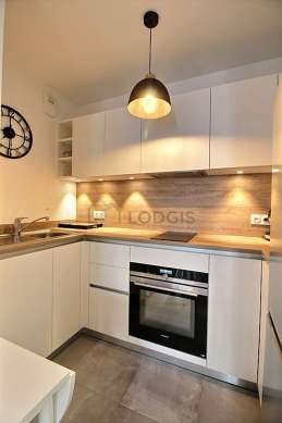 Este apartamento posee una magnífica cocina con azulejo en el sueloy todo el equipamiento esencial para su vida diaria : placas eléctricas, refrigerador, congelador, horno, tostador, estantería, armario empotrado, vajilla.
