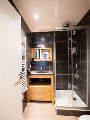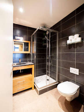 Este apartamento tiene una sala de baño. Este baño tiene todo lo necesario para su bienestar diario : armario empotrado, ducha, sink, radiador seca-toallas. El WC está integrado en la sala del baño.