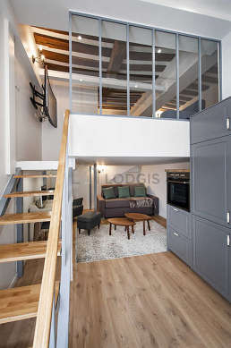 Este dúplex posee una magnífica cocina con parquet en el sueloy todo el equipamiento necesario para su vida diaria : placas eléctricas, refrigerador, congelador, horno, micro ondas, horno micro-ondas, campana extractora, tostador, cafetera, mesa, estantería, armario empotrado, vajilla, 4 silla(s), bin, vase.