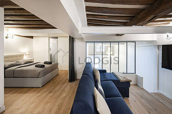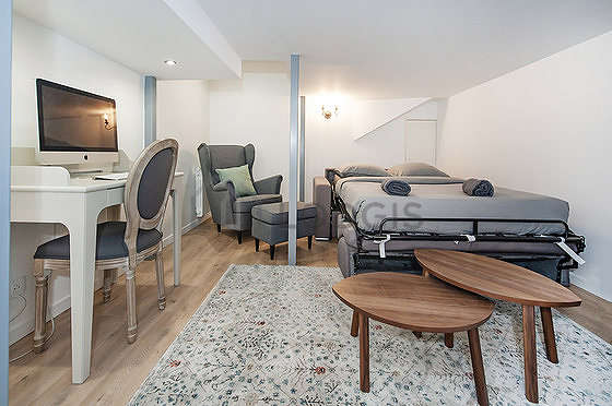 SalónEste dúplex está formado por un salón con parquet en el suelo y ventanas. Este salón muy tanquilo está amueblado y equipado para que su estancia sea agradable : televisor, sofá, 1 sillones, mesita, mesa de estudio, armario empotrado, 1 silla(s)1 sofá cama.