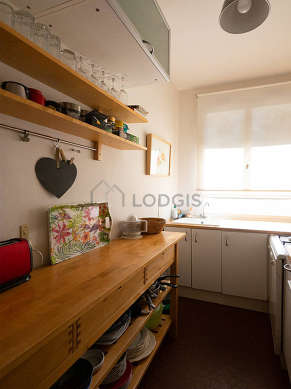 Este apartamento posee una magnífica cocina con azulejo en el sueloy todo el equipamiento esencial para su vida diaria : placas eléctricas, refrigerador, congelador, micro ondas, congelador, tostador, hervidor, cafetera, estantería, vajilla, 1 silla(s).