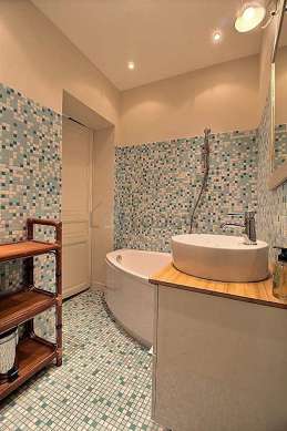 Este apartamento tiene una sala de baño magnífica. Este baño tiene todo lo necesario para su bienestar diario : toallas, estantería, bañera, sink, towel rack. El WC está separado de la sala del baño y ubicado en un espacio independiente.