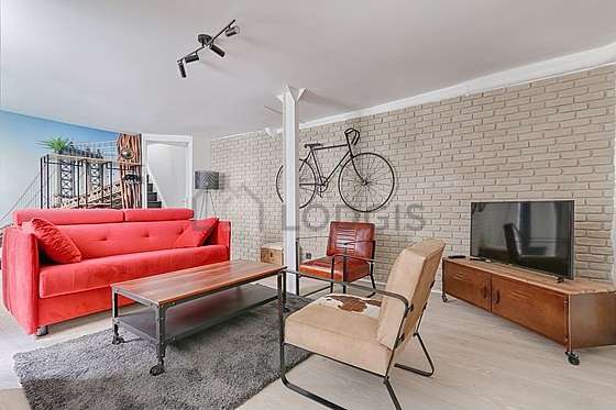 SalónEste dúplex está formado por un salón con parquet en el suelo una vista a al patio. Este salón muy tanquilo está amueblado y equipado para que su estancia sea agradable : televisor, edredones, sofá, 1 sillones, mesa, cómoda, piedras aparentes, 1 silla(s), floor lamp, tv stand, mirror, carpet1 sofá cama.