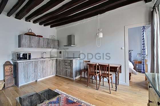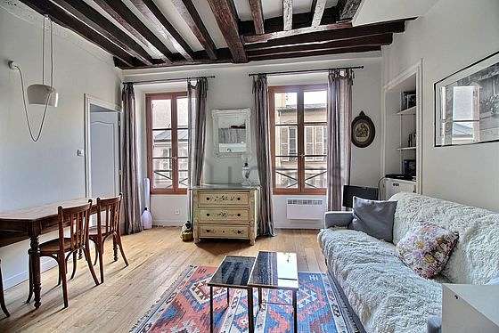 SalónEste apartamento está formado por un salón con parquet en el suelo y ventanas. Este salón muy tanquilo está amueblado y equipado para que su estancia sea agradable : sofá, mesa, mesita, estantería, cómoda, 2 silla(s), painting.