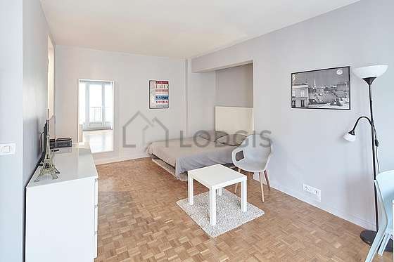 SalónEste apartamento está formado por un salón con parquet en el suelo y ventanas. Este salón muy tanquilo está amueblado y equipado para que su estancia sea agradable : televisor, sábanas, edredones, 1 sillones, mesa, mesita, 2 silla(s), mesita de noche, tv stand1 cama.