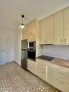 Este apartamento posee una magnífica cocina con azulejo en el sueloy todo el equipamiento indispensable para su vida diaria : placas eléctricas, refrigerador, congelador, horno, horno micro-ondas, campana extractora, tostador, hervidor, cafetera, mesa, ropero, armario empotrado, vajilla, 1 silla(s), taburete, mixer, bin.