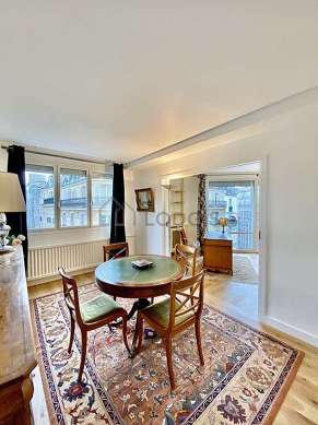 Con el fin de compartir vuestras comidas en un ambiente distendido durante su estancia en París, este apartamento posee un magnífica comedor gracias a mesa, aparador, vajilla, 1 silla(s), painting, set of tables, carpet, vase.