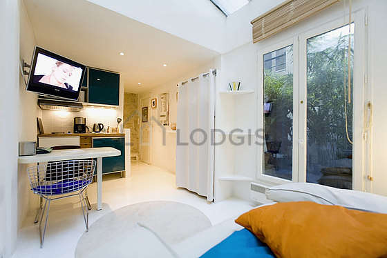 SalónEste apartamento está formado por un salón con cemento en el suelo una vista a al patio. Este salón muy tanquilo está amueblado y equipado para que su estancia sea agradable : televisor, sábanas, edredones, sofá, mesa, ropero, estantería, 1 silla(s)1 sofá cama.