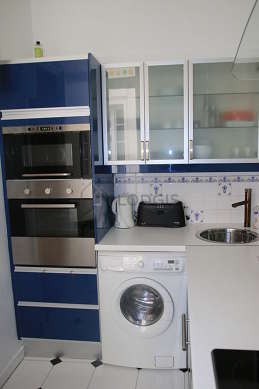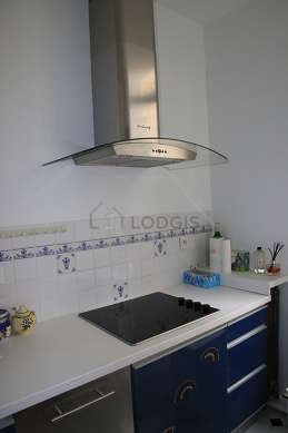 Este apartamento posee una cocina con azulejo en el sueloy todo el equipamiento esencial para su vida diaria : placas eléctricas, refrigerador, congelador, horno, micro ondas, horno micro-ondas, campana extractora, tostador, hervidor, mesa, armario empotrado, vajilla, 1 silla(s).