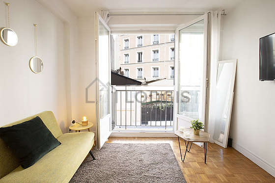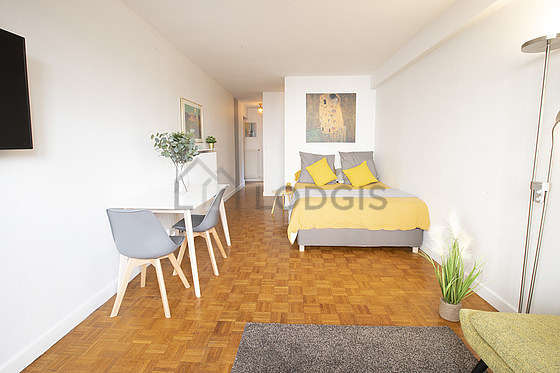 Este apartamento está formado por un salón con parquet en el suelo y ventanas doble acristalamiento y una vista a al patio. Este salón muy tanquilo está amueblado y equipado para que su estancia sea agradable : televisor, sábanas, edredones, refrigerador, sofá, mesa, ropero, estantería, armario, armario empotrado, vajilla, 1 silla(s), mesita de noche, floor lamp, mirror, bin, painting, carpet1 cama.