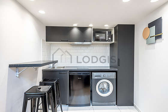 Este apartamento posee una cocinay todo el equipamiento necesario para su vida diaria : placas eléctricas, refrigerador, micro ondas, campana extractora, estantería, armario, vajilla, taburete.