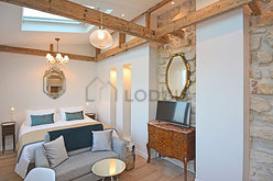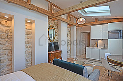 SalónEste apartamento está formado por un salón con parquet en el suelo. Este salón muy tanquilo está amueblado y equipado para que su estancia sea agradable : televisor, sábanas, edredones, refrigerador, sofá, mesa, mesita, mesa de estudio, ropero, estantería, cómoda, armario empotrado, vajilla, piedras aparentes, viga, 1 silla(s), mesita de noche, mirror, bin1 cama.