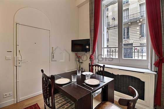 SalónEste apartamento está formado por un salón con parquet en el suelo y ventanas. Este salón muy tanquilo está amueblado y equipado para que su estancia sea agradable : televisor, sábanas, sofá, mesa, estantería, armario empotrado, 3 silla(s)1 armario cama.