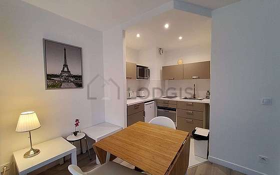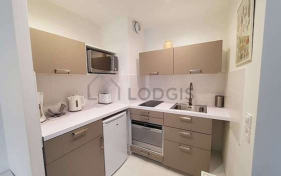 Este apartamento posee una magnífica cocina con azulejo en el sueloy todo el equipamiento indispensable para su vida diaria : placas eléctricas, refrigerador, horno micro-ondas, tostador, cafetera, estantería, armario empotrado, vajilla, bin, ventilator.