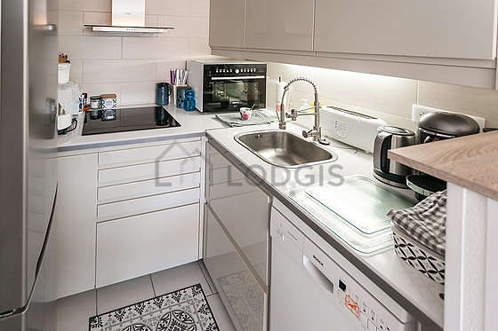 Este apartamento posee una magnífica cocina con azulejo en el sueloy todo el equipamiento indispensable para su vida diaria : placas eléctricas, refrigerador, horno, micro ondas, campana extractora, tostador, hervidor, cómoda, armario empotrado, vajilla, towel rack, bin, carpet.