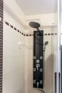 Este apartamento tiene una sala de baño magnífica y clara. Este baño tiene todo lo necesario para su bienestar diario : toallas, cómoda, armario empotrado, ducha, secador de pelo, lavabo electrico, sink, mirror, bin, carpet. El WC está integrado en la sala del baño.