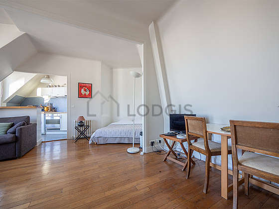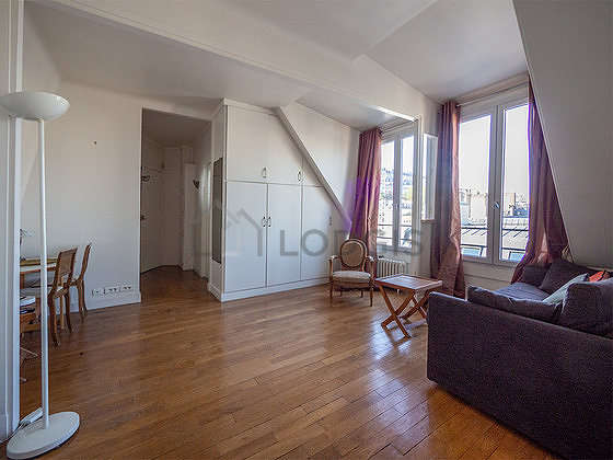 SalónEste apartamento está formado por un salón con parquet en el suelo. Este salón muy tanquilo está amueblado y equipado para que su estancia sea agradable : televisor, edredones, sofá, 1 sillones, mesa, ropero, armario, armario empotrado, 1 silla(s), mesita de noche.