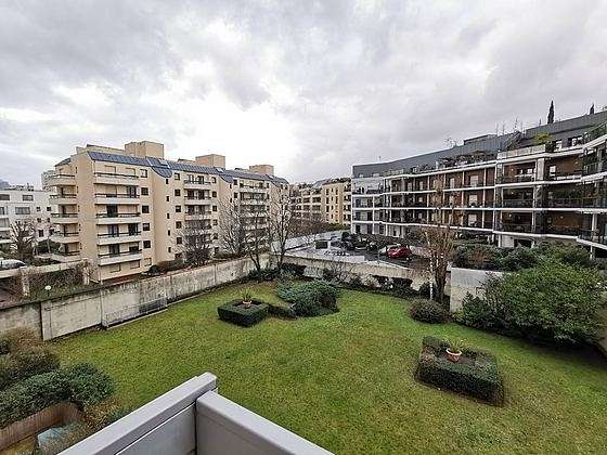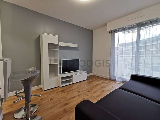 SalónEste apartamento está formado por un salón con parquet en el suelo y ventanas doble acristalamiento, un balcon y una vista a jardín. Este salón muy tanquilo está amueblado y equipado para que su estancia sea agradable : televisor, sábanas, edredones, sofá, mesa, estantería, armario empotrado, vajilla, 1 silla(s), tv stand1 sofá cama.