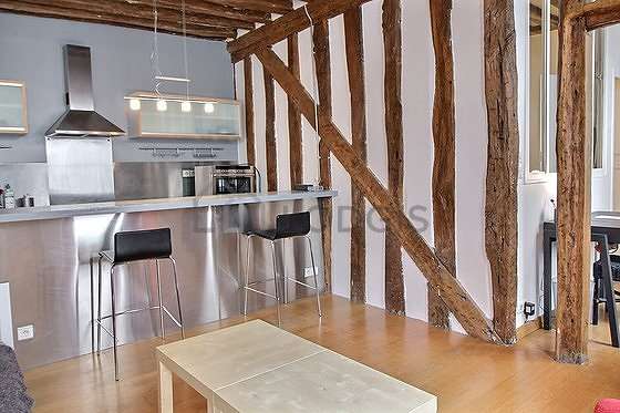 Este apartamento posee una magnífica cocina con parquet en el sueloy todo el equipamiento necesario para su vida diaria : placas eléctricas, refrigerador, horno micro-ondas, campana extractora, tostador, hervidor, cafetera, estantería, armario empotrado, vajilla, taburete, bar.