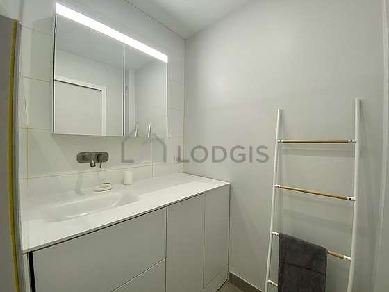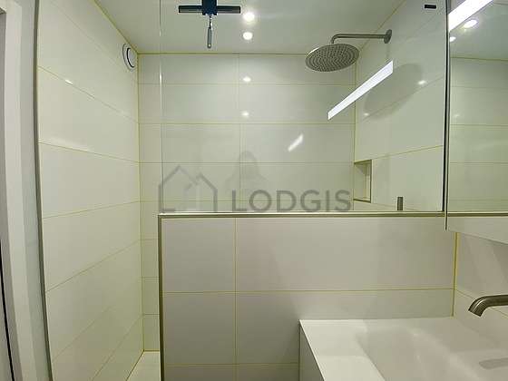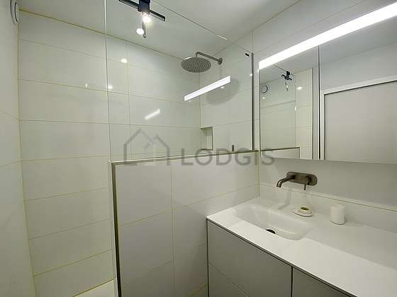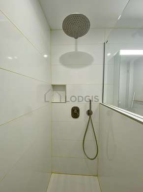 Este apartamento tiene una sala de baño magnífica y clara. Este baño tiene todo lo necesario para su bienestar diario : toallas, armario empotrado, ducha, airer, sink, mirror, towel rack, ventilator. El WC está separado de la sala del baño y ubicado en un espacio independiente.