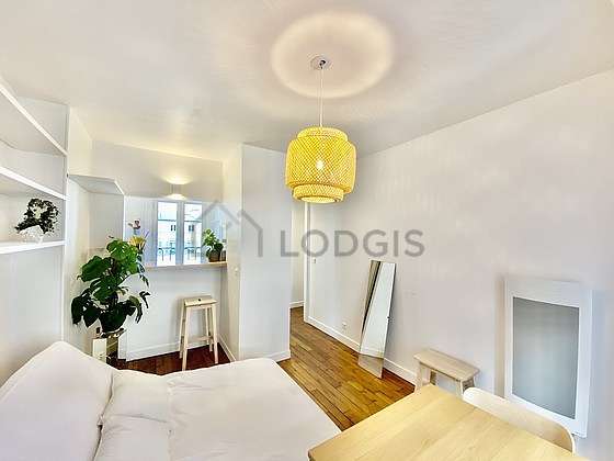 SalónEste apartamento está formado por un salón con parquet en el suelo y ventanas. Este salón muy tanquilo está amueblado y equipado para que su estancia sea agradable : mesa, estantería, armario empotrado, taburete, mesita de noche1 sofá cama.