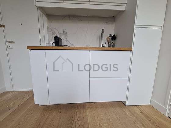 Este apartamento posee una cocina con parquet en el sueloy todo el equipamiento necesario para su vida diaria : placas eléctricas, refrigerador, horno micro-ondas, congelador, cafetera, mesa, armario empotrado, vajilla.
