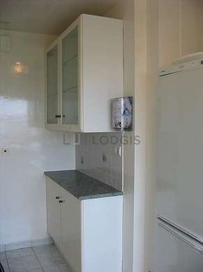 Este apartamento posee una bonito cocina con azulejo en el sueloy todo el equipamiento necesario para su vida diaria : placas eléctricas, refrigerador, congelador, horno, micro ondas, hervidor, cafetera, mesa, armario empotrado, vajilla, 2 silla(s).