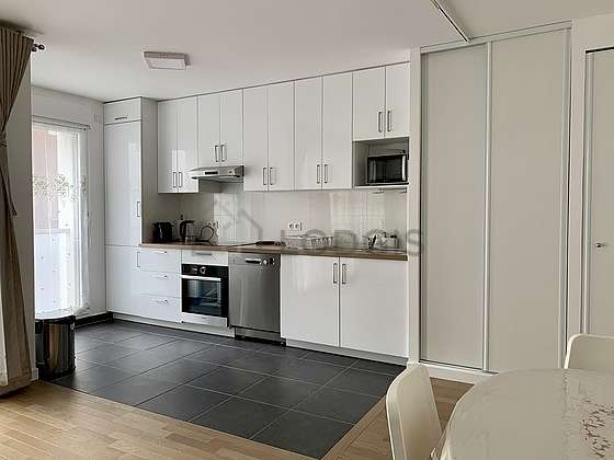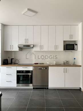 Este apartamento posee una magnífica cocina con azulejo en el sueloy todo el equipamiento necesario para su vida diaria : placas eléctricas, refrigerador, congelador, horno, micro ondas, campana extractora, tostador, cafetera, mesa, armario, vajilla, bin.