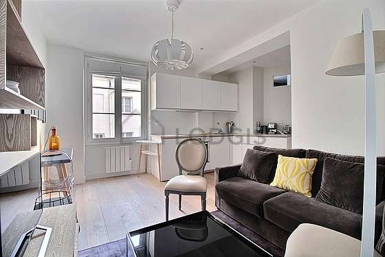 SalónEste apartamento está formado por un salón con parquet en el suelo y ventanas. Este salón muy tanquilo está amueblado y equipado para que su estancia sea agradable : televisor, edredones, sofá, mesita, estantería, 1 silla(s), floor lamp, mirror, carpet.