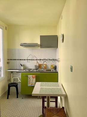 Este apartamento posee una bonito cocina con parquet en el sueloy todo el equipamiento necesario para su vida diaria : placas eléctricas, refrigerador, horno micro-ondas, campana extractora, tostador, mesa, estantería, armario empotrado, vajilla, 1 silla(s).