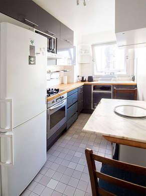Este apartamento posee una magnífica cocina con azulejo en el sueloy todo el equipamiento esencial para su vida diaria : placas eléctricas, refrigerador, congelador, horno, micro ondas, campana extractora, tostador, hervidor, cafetera, mesa, estantería, armario empotrado, vajilla, 2 silla(s), mixer.